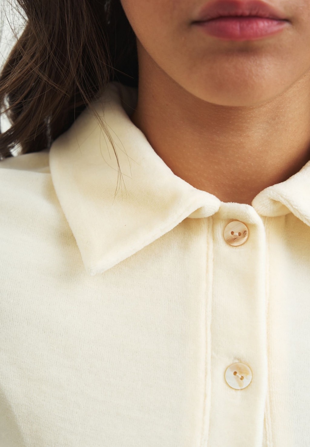 Невероятно приятный на ощупь комбинезон в длине мини выполнен из мягкого хлопкового дышащего велюра, имеет нежную и приятную бархатистую фактуру. Пуговицы выполнены из натуральной ракушки.